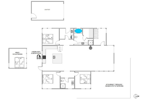 På sydsiden af feriehuset, finder i sommerhusets udebruser, som er oplagt at bruge efter en god tur på stranden, for at få skyllet det værste sand af kroppen. OBS. Udebruseren er åben fra april-november.