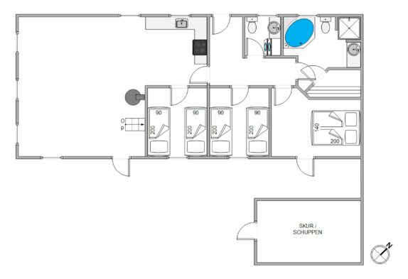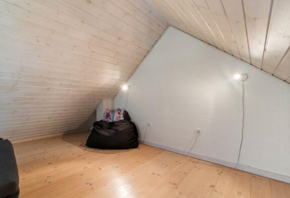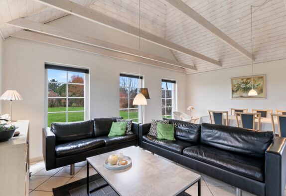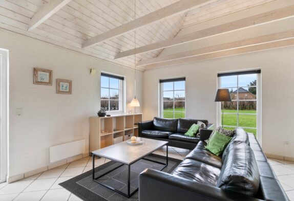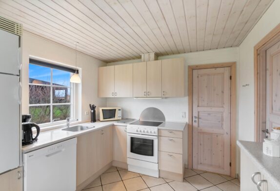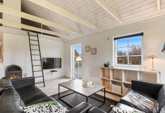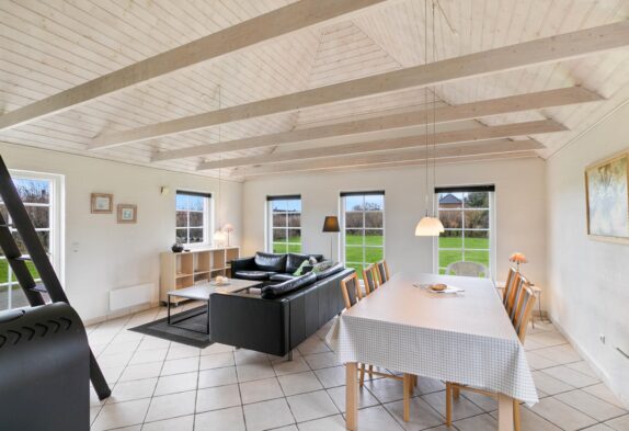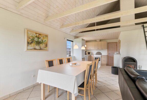 Dette sommerhus er yderst velholdt, så det forbliver lyst og indbydende, hvor både familier og par har lyst til at tilbringe deres ferier. Stue, køkken og spisestue har man i et stort rum i hjertet af huset. Her er der indlagt gulvarme og installeret en hyggelig brændeovn. Så dette er et naturligt samlingspunkt, hvor familien kan tilbringe tid sammen og virkelig slappe af. En god detalje ved dette rum, er helt klar loftet som går til kip, og der her er synlige træbjælker. De er med til at give rummet en god rummelighed, der er med til at bidrage til, at I kan slappe af med en god fornemmelse i maven.