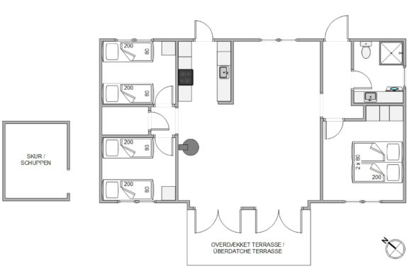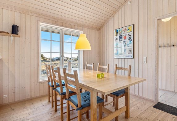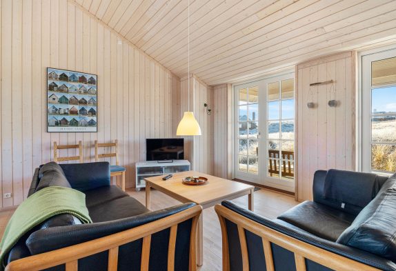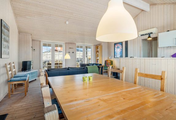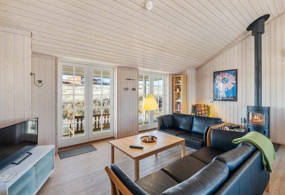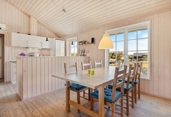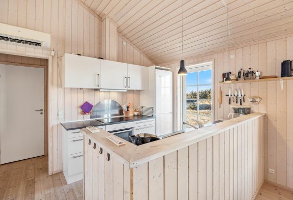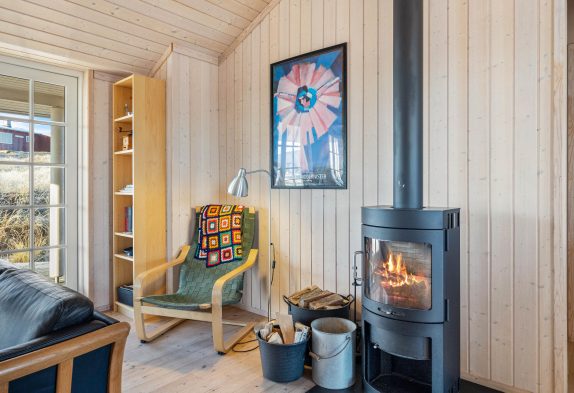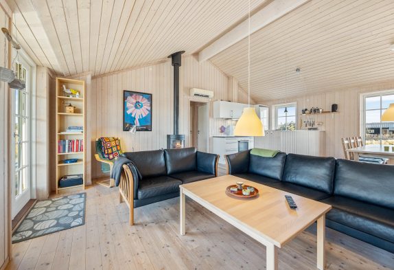 Sommerhuset har tre gode og lyse soveværelse og et stort badeværelse med vaskemaskine. Midt i huset ligger stue og køkken/alrum, et stort og flot rum med masser af lys. Her er tilmed også loft til kiå, hvilket gør rummet endnu mere attraktivt og indbydende. Det er også her I stuen, hvor I finder husets brændeovn, som altid er klar til at skabe en hyggelig og varm atmosfære. Hvis I ikke ønsker at bruge brændeovnen, er den effektive luft-til-luft varmepumpe for et behageligt indeklima året rundt.