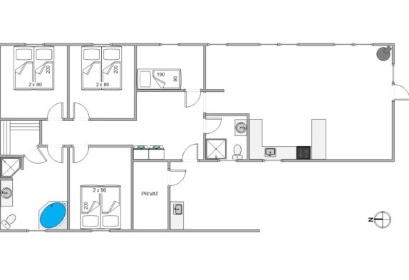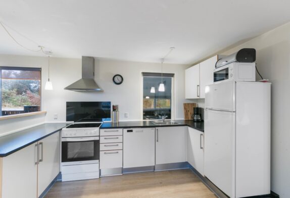 Feriehuset byder også på to badeværelser, og det ene badeværelse er udstyret med brusebad og det andet med både spa og sauna – perfekt til at slappe af og nyde en afstressende ferie med hele familien.