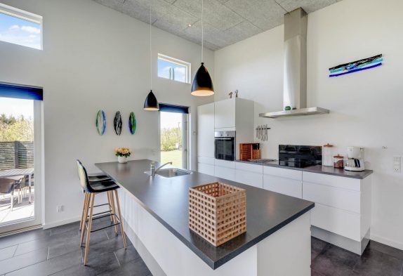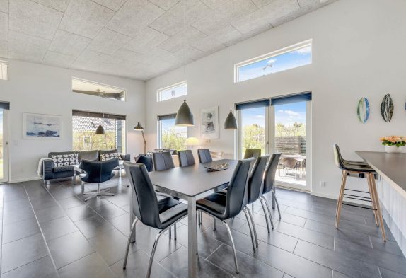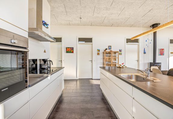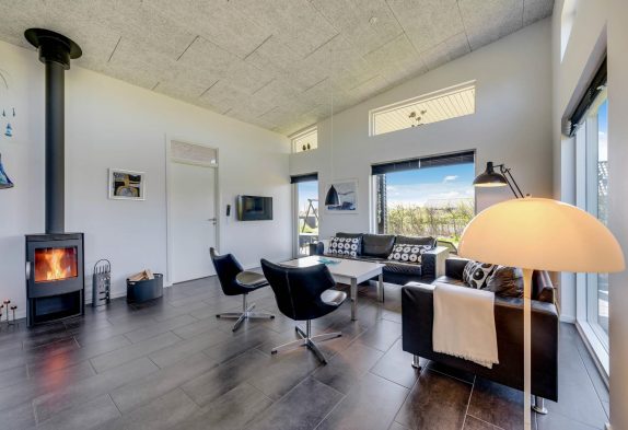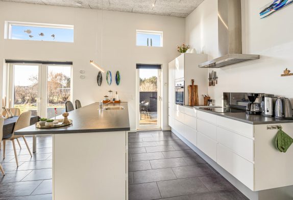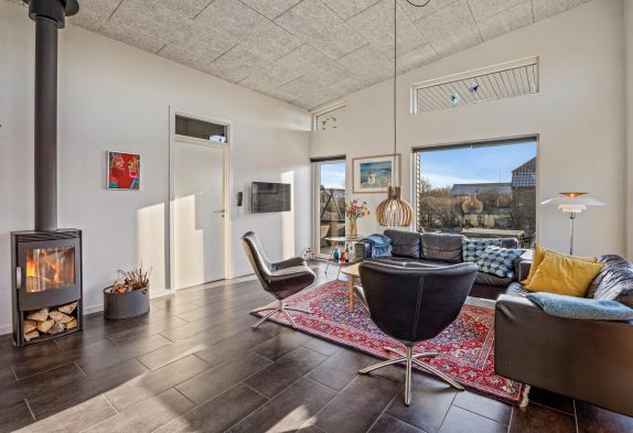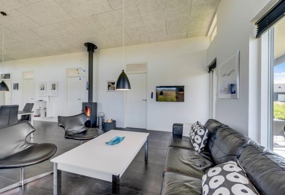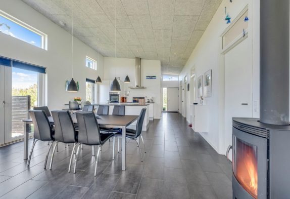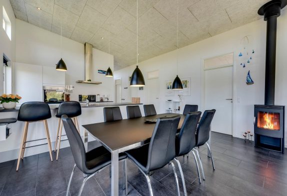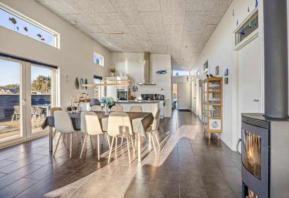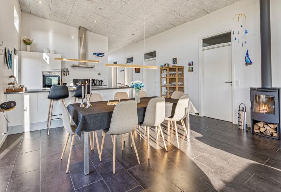 Stue, spisestue og køkken ligger i åben forbindelse og er et super dejligt rum med brændeovn, der kan varme det hele op, på de lidt koldere dage. Her er i det store opholdsrum er det sikret, at I altid kan tilbringe tid med hinanden. I kan spille spil sammen, nyde en god film på fladskærms tv’et eller holde kokken i selskab, mens der bliver forberedt et lækkert måltid i det veludstyrede køkken. Feriehuset er naturligvis også udstyret med trådløs internet forbindelse, så I kan holde jer opdateret under ferien.