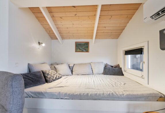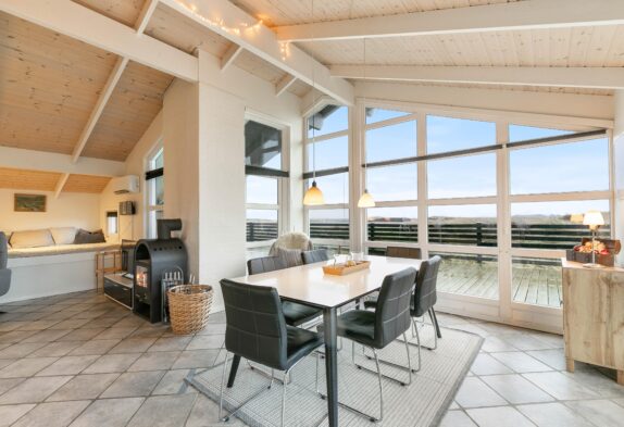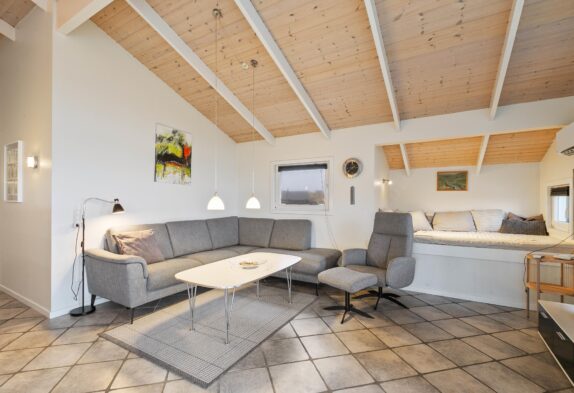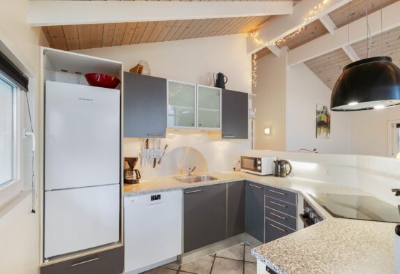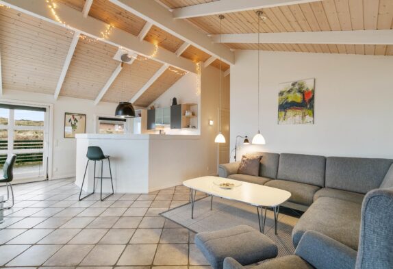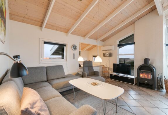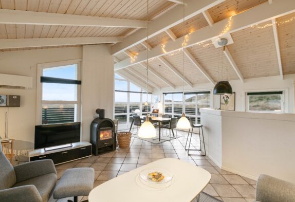 Feriehuset er flot og hyggeligt indrettet, så I har de helt rigtige omgivelser til en afslappende ferie med familien. I stuen er der både brændeovn og en hyggekrog i form af en alkove, hvor I kan ligge og se en god film eller læse en spændende bog. Fra stuen er der åben forbindelse til køkkenet og spiseafdelingen med udsigt over naturgrunden, hvilket er med til at skabe et stort dejligt rum, hvor I virkelig kan nyde hinandens samvær og holde en god ferie.