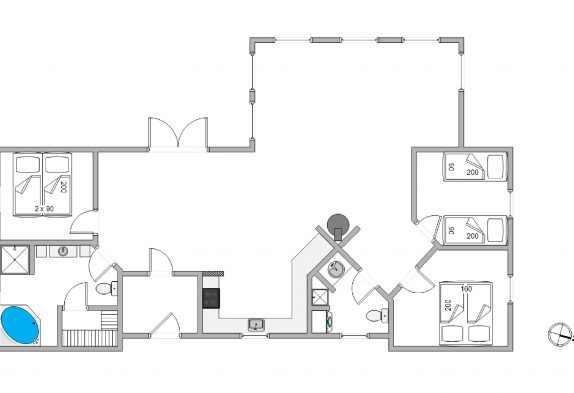 Sommerhuset har 2 badeværelser. Begge med gulvvarme og bruseniche. I det store badeværelse finder I et lækkert, rundt spabad og indgang til husets sauna, så I også kan nyde et strejf hjemme-wellness.