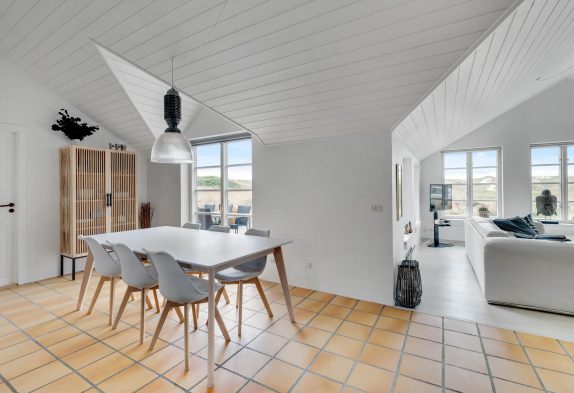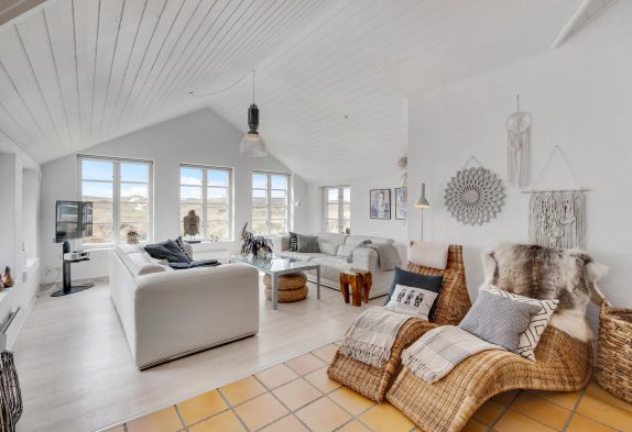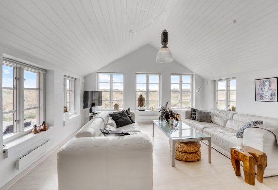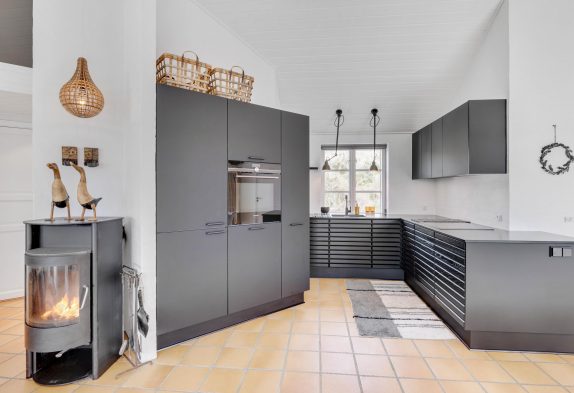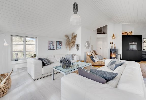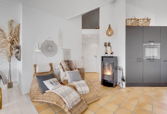 Køkkenet er i åben forbindelse med spisestuen. Køkkenet er yderst veludstyret, og her kunne amatørkokken uden tvivl forberede en lækker middag. I den hyggelige og smagfuldt indrettede stue er der et smukt lysindfald fra de høje vinduespartier og ikke mindst en fantastisk udsigt. Her finder I flere hyggekroge, hvor I kan slå jer ned og slappe af. Endnu et af sommerhusets highlights er brændeovnen, der på de køligere dage kan hjælpe med at varme sommerhuset op, og ikke mindst hjælpe med at sprede en masse feriehygge og god atmosfære