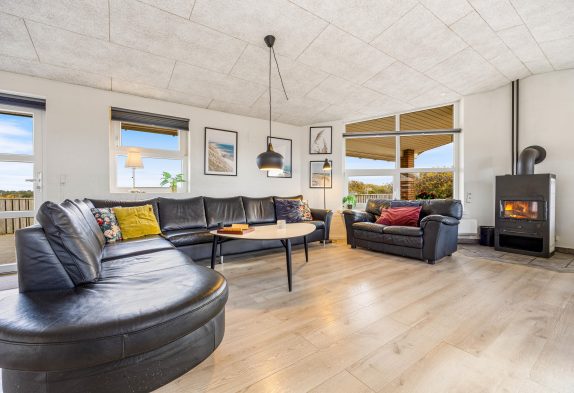 Det lækre arkitekttegnede feriehus har en smuk placering mellem hav og fjord – på en klittop med fantastisk udsigt over området. Placeringen mellem hav og fjord giver rige muligheder for gåture langs den endeløse strand, som ligger kun fem minutters gang fra ferieboligen, eller anlagte stier på heden.