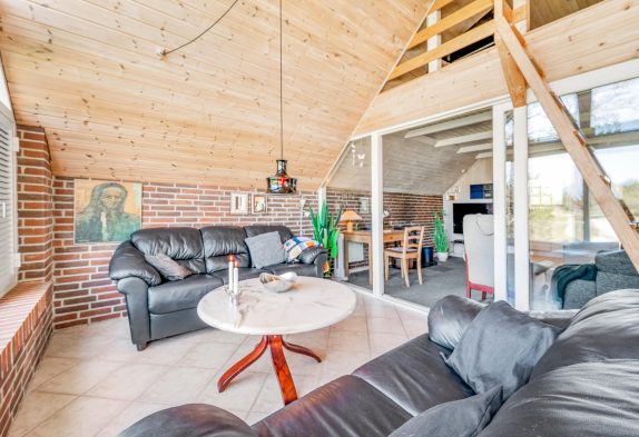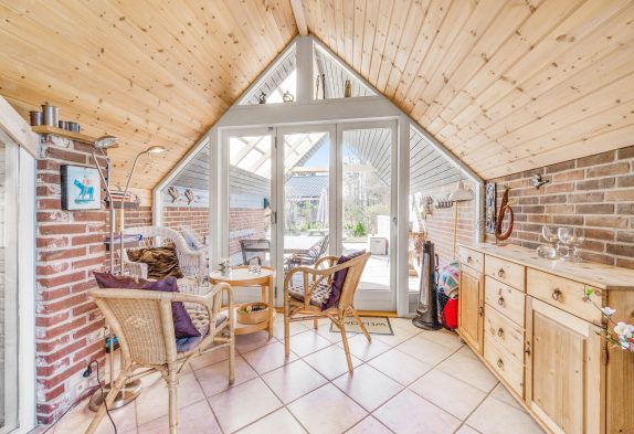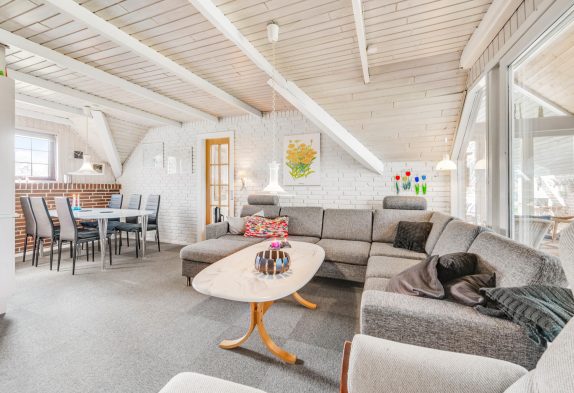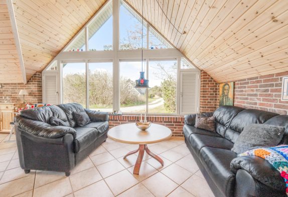 Det store stenhus på Hjelmevej 7 oser af charme både udvendigt og indvendigt. De røde mursten kombineret med de lyse træfarver skaber en hyggelig stemning indenfor, som bliver fulgt op af den afslappede indretningsstil med et hav af små detaljer – her er der dømt ægte sommerhusferie, langt væk fra den travle hverdag.