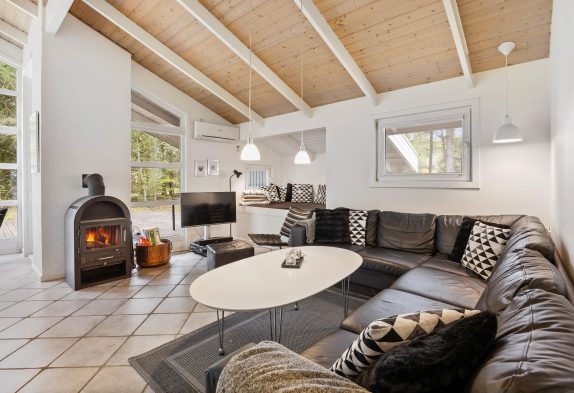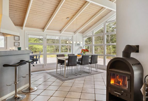 Det dejlige køkken er med åben forbindelse til stuen og spisestuen, så man har et stort og pragtfuldt rum, hvor mange timer kan tilbringes sammen med familien eller vennerne. Og her spreder brændeovnen både varme og hygge på de lidt køligere dage. Overalt i huset er der gulvvarme, og den energibesparende varmepumpe sørger for, at elregningen ikke løber løbsk.
