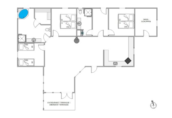 På den store flotte lukkede terrasse, kan du nyde den friske luft året rundt. Her kan I ugeneret nyde udelivet og lade ungerne lege, mens I slapper af med en god bog, eller fyrer op under grillen. Udover den store og lukket terrasse, kan sommerhuset på Risbjergvej også tilbyde en stor plænegrund, hvor der til børnenes fornøjelse også er en sandkasse