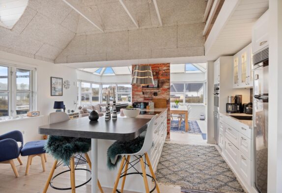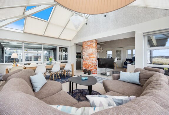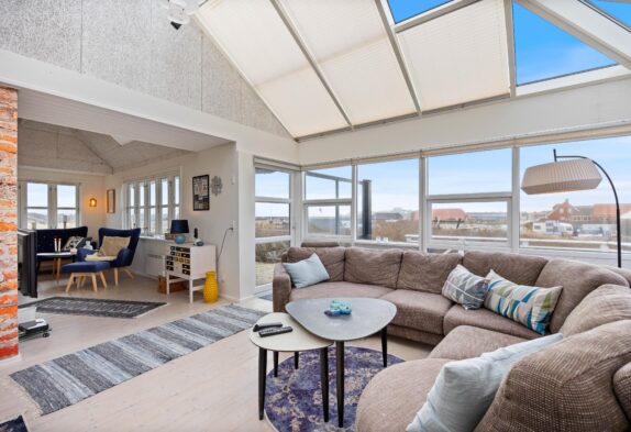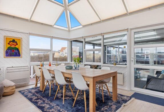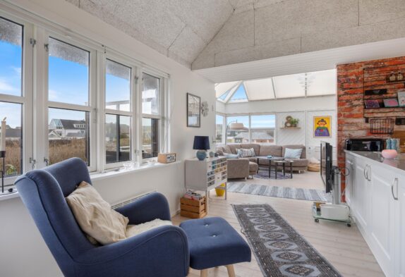 Stuen er rigtig hyggelig og stilfuldt indrettet med lækre og komfortable møbler. Her er der et fladskærms-TV, radio og gratis trådløst internet, så I kan virkelig føle jer hjemme. Udestuen ligger i forbindelse med stue og køkken, og helt mod vest. Den er fantastisk, der er et vidunderligt lys i den, og den er smukt forbundet med resten af huset, selvom den er meget anderledes, primært fordi der er loft til kip samt store vinduespartier. Her kan I sidde trygt og varmt, og bare føle jer i et med den omkringliggende natur.
