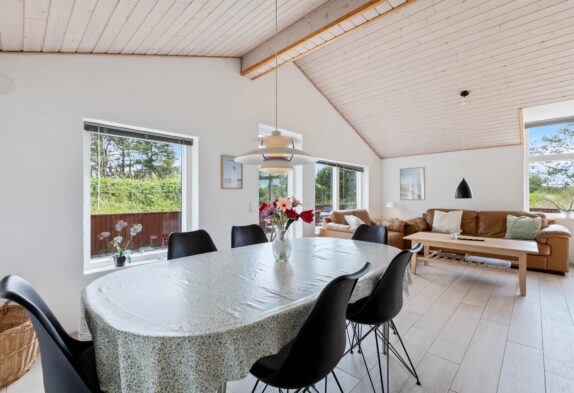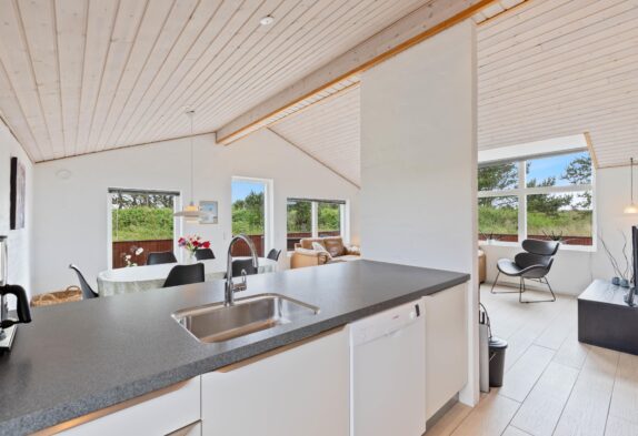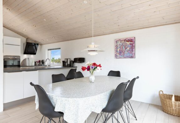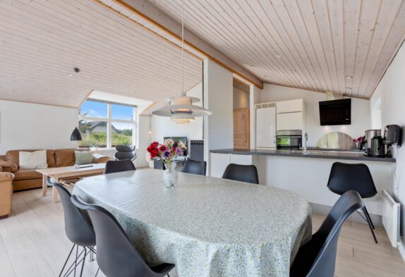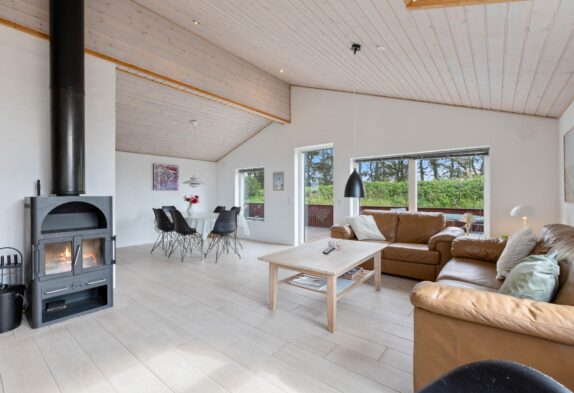 Midt i sommerhuset finder I det store køkken-alrum, hvor der virkelige er sat nogle gode rammer, for at I kan have en fantastisk ferie. Loftet til kip giver hele rummet en god rummelighed og rumfornemmelse, og samtidig med en brændeovn er placeret midt i rummet, kan I med fordel tænde op i denne, og bare nyde den fantastiske varme og hygge som den spreder. I stuen er der også et fladskærms-tv, hvortil der er en google Chromecast, der sikrer at I kan føle jer endnu mere hjemme, for den tillader jer at se lige hvad I ønsker, når I ønsker det.