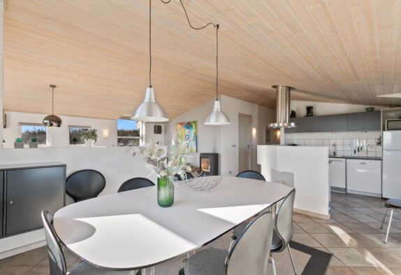Dette lækre kvalitetshus ligger på den meget attraktive vej, Krylen, i Houvig. Det blev moderniseret i 2013, hvor et flot materialevalg, rengøringsvenlige klinkegulve med gulvarme samt en stilren indretning blev vægtet tungt, netop for at give feriegæster de bedste forudsætninger for en dejlig sommerhusferie med moderne bekvemmeligheder.