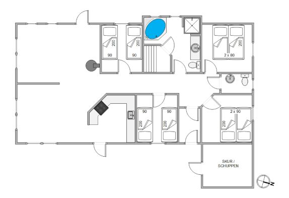 Sommerhuset kan huse op til 8 personer, der kan fordele sig på 4 værelser, hvor 2 af værelserne er med dobbeltseng og de sidste 2 værelser er med 2 enkeltsenge. For at passe til resten af husets størrelse, er sommerhuset udstyret med et stort badeværelse og et ekstra gæstetoilet – Så undgår I de alt for lange køer på morgenerne. Det ene badeværelse gemmer også på nogle dejlige overraskelser. Her finder I nemlig både et spabad og en sauna, så her kan I virkelig nyde ferien og tage et smut i “hjemmewellness”.