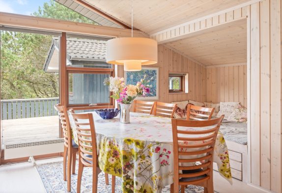 På Bjerregårdsvej 103 ligger dette skønne sommerhus, som er veludstyret og smagfuldt møbleret. Feriehuset har en dejlig stor terrasse i 2 niveauer, som indbyder til mange hyggelige timer i det gode vejr. Mod nordvest har du perfekte forhold til en grillaften i solen. Og er du knap så heldig med vejret, kan du opholde dig på den dejlige overdækkede terrasse mod vest.