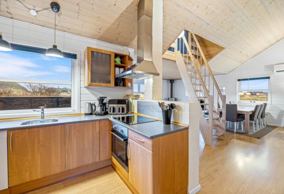 Udover et stort og lækkert badeværelse er der også et gæstetoilet med gulvvarme. På badeværelset er der gulvvarme, bruseniche, 2 personers hjørnespa og en sauna. Køkkenet er stort og godt indrettet med alle de moderne hjælpemidler, man kan ønske sig. Stuen er placeret i den vestlige del af feriehuset og er hyggeligt indrettet med gode møbler.