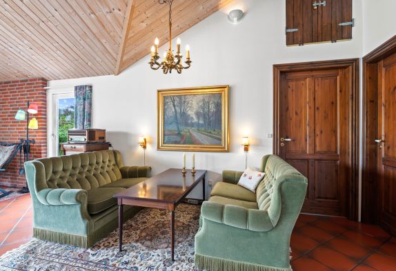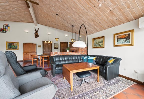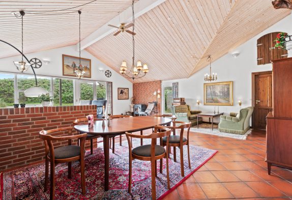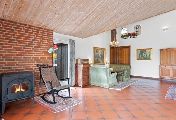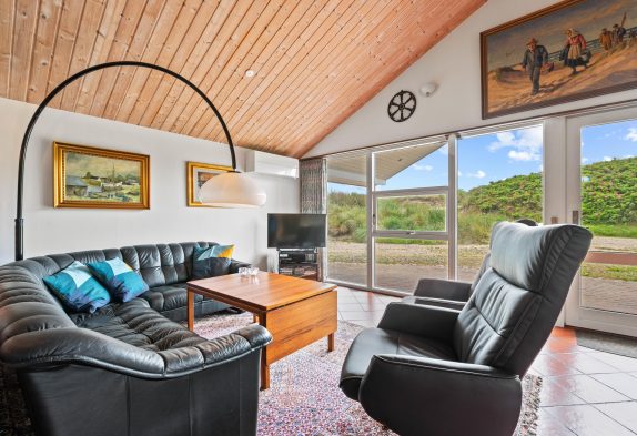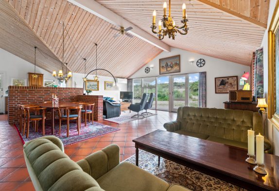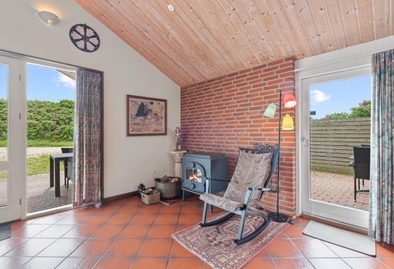 Feriehuset har en spændende og personlig indretningsstil, og i den rummlige stue er der indrettet både spiseafdeling, tv-hjørne samt en lille hyggekrog tæt på brændeovnen. Så her har I rig mulighed for at tilbringe tid sammen, selvom det er omkring forskellige aktiviteter.