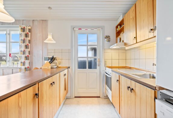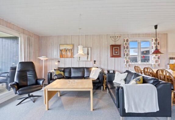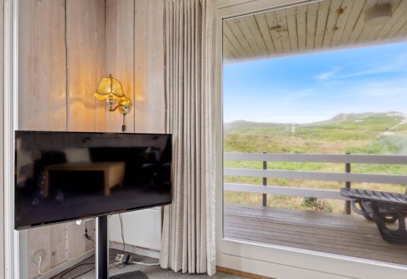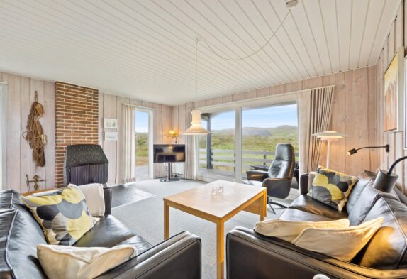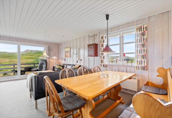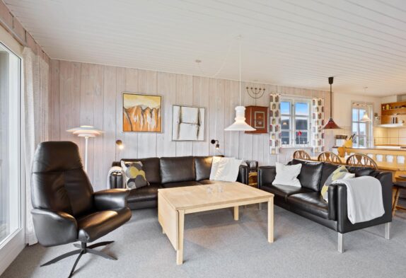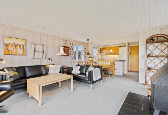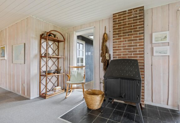 Samlingspunktet bliver uden tvivl alrummet, som forener køkken og stue. Saml jer omkring brætspil eller tag feriekrimien med hen i sofaen – samtidig med at brændeovn knitrer i baggrunden og spreder hygge og varme. Herfra har I desuden også udsigt over det smukke kuperede klitlandskab.
