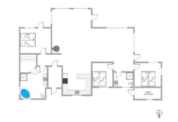 Dette hyggelige feriehus har tre rummelige soverum, hvilket sikrer, at I alle kan finde jer godt til rette. Takket være de to badeværelser vil der aldrig være kø om morgenen. Gulvvarme i badeværelset giver ekstra komfort på kolde dage, og saunaen samt tømmespaen tilbyder den ultimative afslapning efter en lang dag med eventyr.