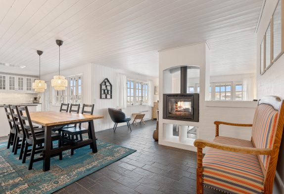 Når du træder ind i dette sommerhus, vil du straks mærke den rolige og afslappende stemning. Her er der rigtig sommerhusstemning, med brændeovn og klinkegulv. Sommerhuset fremstår lyst og indbydende med de hvide vægge og de smukke rustikke klinkegulve.