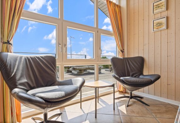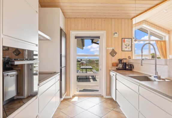 Den skønne terrasse er udført rigtigt flot. Den strækker sig langt omkring huset. På store dele af den, er der god afskærmning af glas, som både beskytter for vinden og sikrer at man udnytter den skønne udsigt bedst muligt. Der er både udsigt til Ringkøbing Fjord i øst og til det smukke klitlandskab i vest. Der er to steder, hvor terrassen er delvist overdækket, perfekt til hyggelige aftener med veltilberedte grillmiddage (gasgrill)