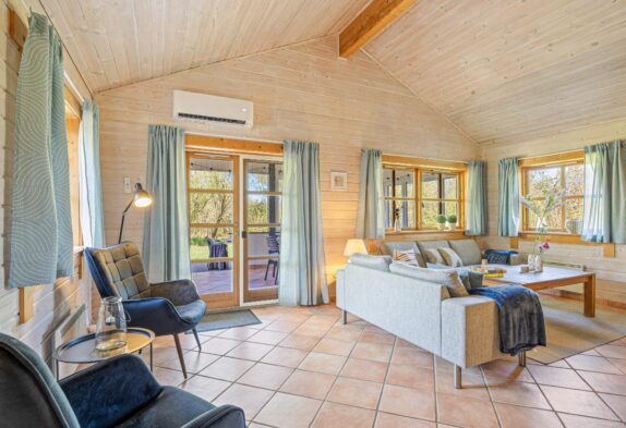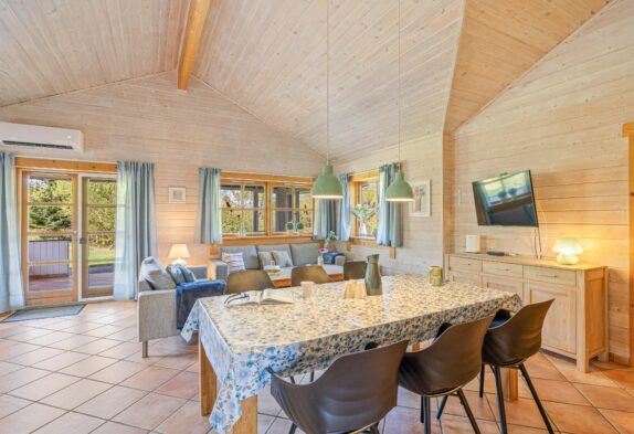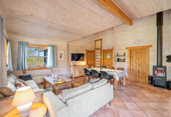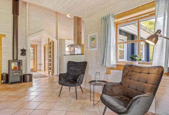 Huset er et flot og rustikt bjælkehus, som fremstår indbydende og velholdt. Der er trævægge og trælofter overalt i huset og i køkken/alrummet er der loft til kip. Dette hus er perfekt til familien, som ønsker sig en fredfyldt ferie med god mulighed for at få batterierne ladet op. Feriehuset råder over en brændeovn, hvorfra I på de lidt køligere dage har mulighed for at samles omkring brændeovnen og nyde varmen og de knitrende lyde. I dette område er der god plads mellem husene, og dette hus er placeret helt ud til et åbent landskab mod nord.