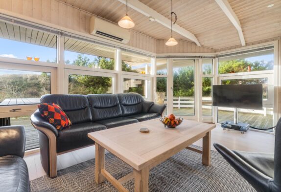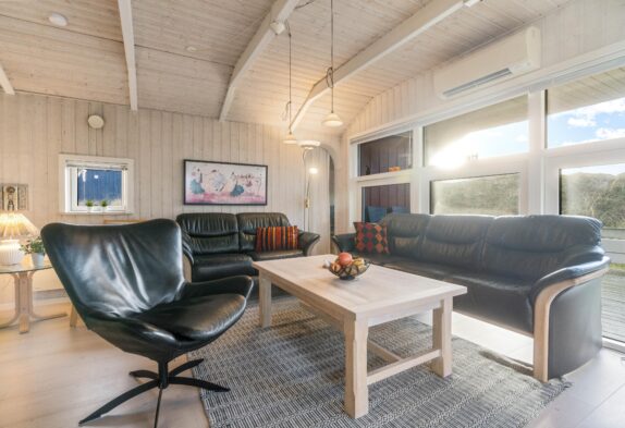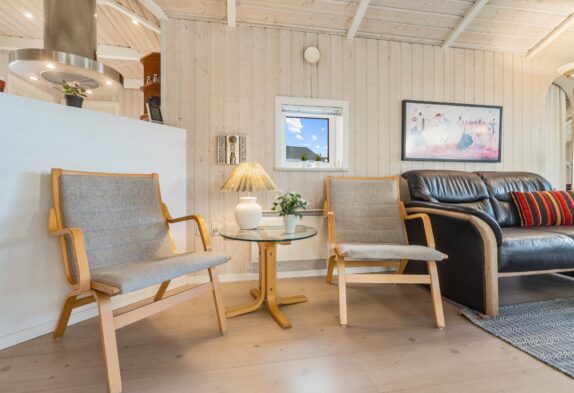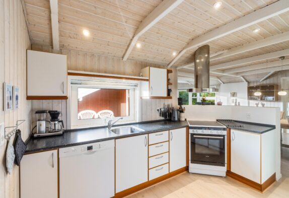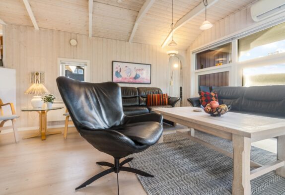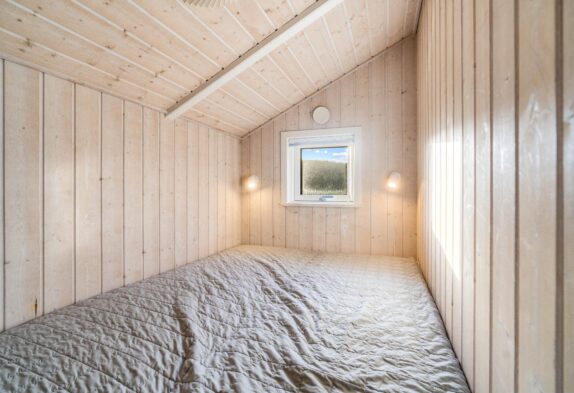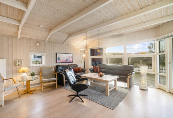 Indendørs er sommerhuset klassisk indrettet med lyse trævægge, der skaber en varm og imødekommende stemning. Store vinduespartier mod syd og vest lukker lyset ind og giver en fin forbindelse til naturen udenfor. I stuen kan I tænde op i brændeovnen og nyde en stille stund med en god bog eller et brætspil, mens varmepumpen sørger for en behagelig temperatur hele året.