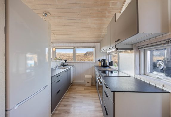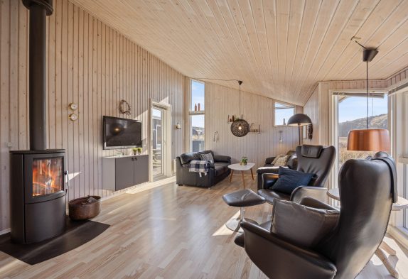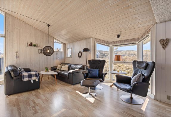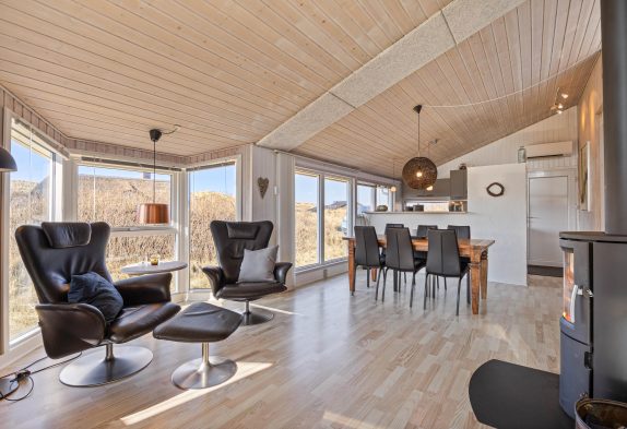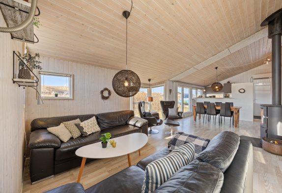 I sommerhusets køkkenalrum finder i den afslappende stue med de smukke brune lædermøbler. Her har I mulighed for at nyde den skønne brændeovn, tage en lille lur eller se en god film. I den anden ende af køkkenalrummet finder i det moderne køkken. Her kan I se ind til stuen, så i stadig kan hyggesnakke med jeres familiemedlemmer.
