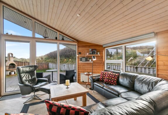 Udsigten til klitter og landskab er skøn mange steder fra dette hus og fra terrasserne. Den store terrasse rundt om huset, er lukket, delvist afskærmet og delvist overdækket, her kan I lade børn og kæledyr løbe frit rundt og udforske terrassen.