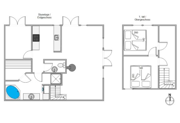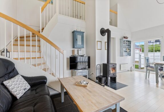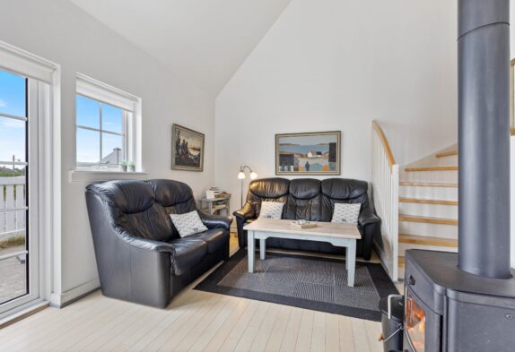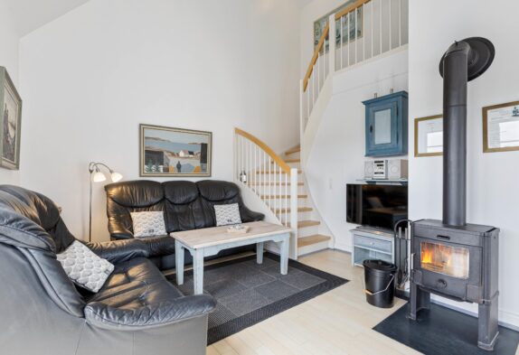 Ferielejligheden er en del af et flerfamiliehus med i alt 4 feriehuse. Hver har 2 etager og sin egen indgang samt en lukket terrasse. I stueetagen er der et køkken med opvaskemaskine, et badeværelse med tømmespa og en stue med både brændeovn, samt et spise- og TV-hjørne, hvor I kan hygge jer med brætspil og jeres yndlingsserie. De 2 soveværelser med hver deres dobbeltseng er på 1. sal.