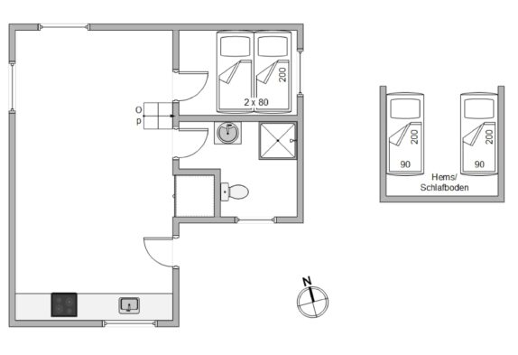 Hyttens plads er godt udnyttet og en lille familie har det de har behov for. En hems er altid populær for familiens yngste og til de voksne er der naturligvis et soveværelse. Der er praktiske trælaminat gulve og loft til kip. Udenfor er hytten der en god terrasse, hvor der ofte kan findes læ til hyggelige grill aftener i de varme måneder.