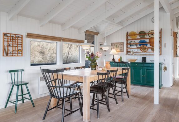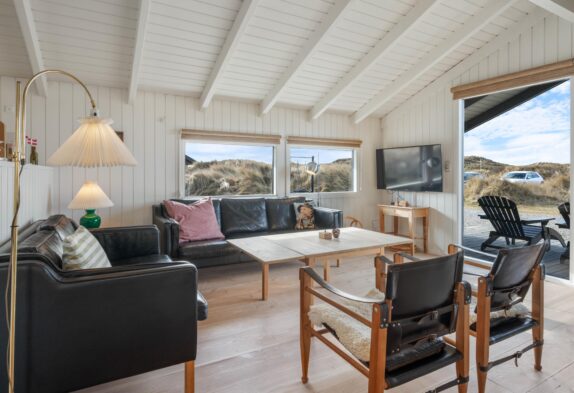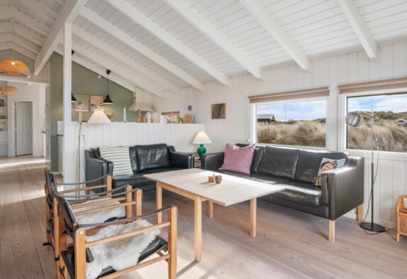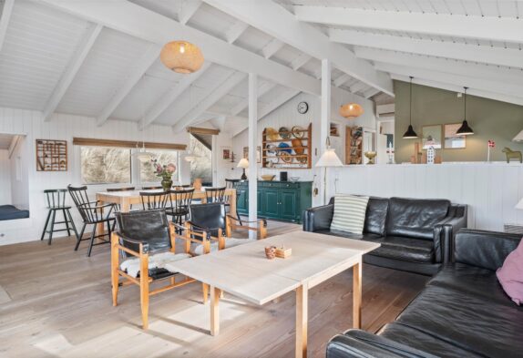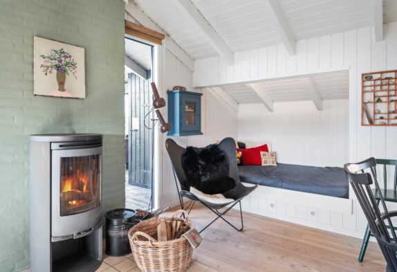 Sommerhuset er indrettet med fokus på afslapning, komfort og velvære. Har I været ude i den friske luft hele dagen, er det dejligt at kunne lade kroppen op i varmen fra saunaen eller vandet i spabadet. Ligesom huset falder i ét med naturen udenfor, så har man også i husets indretning inviteret naturen indenfor. Indretningen er holdt helt enkelt med lyse vægge, lofter og gulve samt flotte, enkle møbler. Det gør, at naturen kommer til sin ret, og den får en central placering både ude og inde.