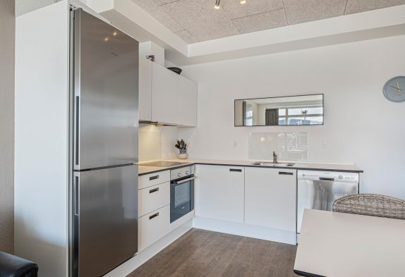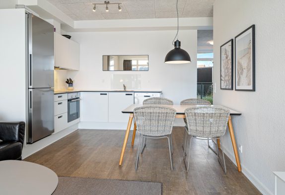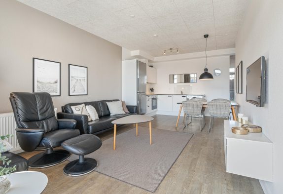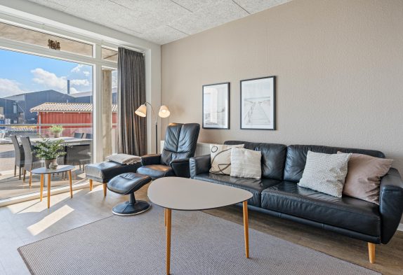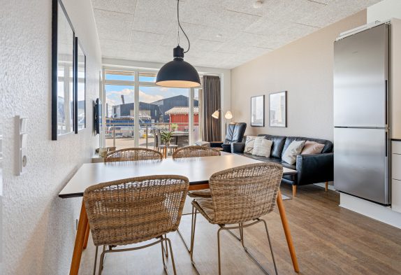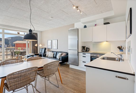 Ferielejlighedens hjerte er det åbne fællesrum, hvor køkken og stue er slået sammen. Her kan I samles om madlavningen, spise gode feriemiddage og flade ud på sofaen, mens mørket falder på uden for vinduet. Herfra har I desuden udsigt til den charmerende fjordhavn.