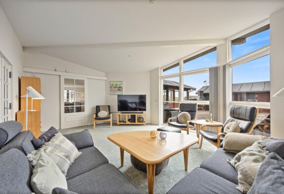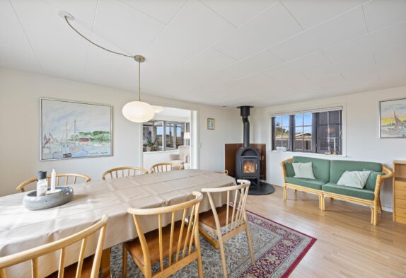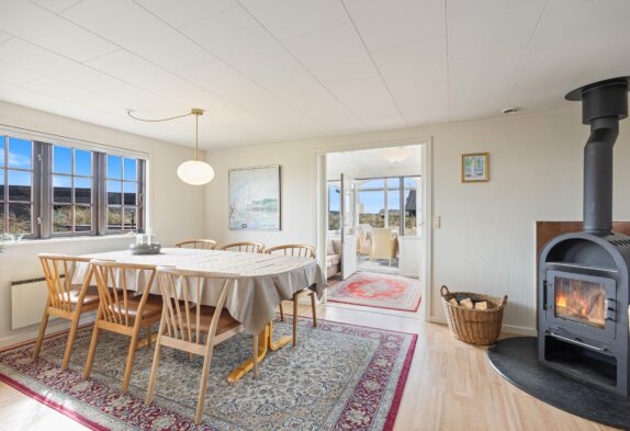 Dette sommerhus råder over 3 soveværelser, 2 badeværelser og en lækker udestue, der kan bruges året rundt. I stuen kan I sætte jer til rette med en god bog og nyde flammerne fra brændeovnen.