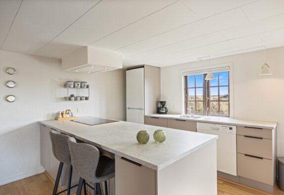 Det ene af de to lyse badeværelser er udstyret med et lækkert spabad. Her kan I nyde boblerne i jeres egen wellnessoase. Dagens små øjeblikke er også indtænkt i husets faciliteter. Både opvaskemaskine, vaskemaskine og tørretumbler gør hverdagen i sommerhuset lidt nemmere.