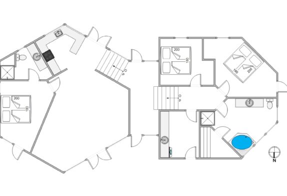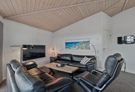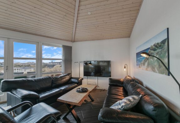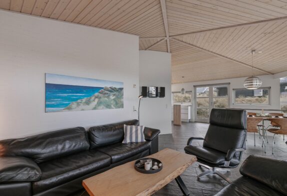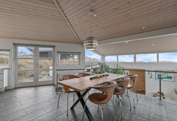 På Nordsøvej 212 i Søndervig, bare 300 meter fra det brusende Vesterhav og det dejlige hvide strandsand, finder I dette helt unikke og arkitekttegnet sommerhus. Det arkitekttegnet sommerhus er opført i tre forskudte planer, og tilbyder en af Søndervigs bedste panoramaudsigter. Sommerhusets spændende form skaber flere dejlige kroge rundt i hele huset både inde såvel som ude.
