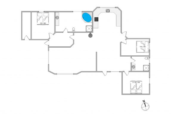 Klitdalen 16 fordeler sig på tre soverum, hvoraf de to soverum har deobbelsenge og det sidste enkeltsenge. Der er to badeværelser, hvoraf det ene har både sauna og spabad. Så I kan opleve lidt ekstra afslapning på ferien og forkæle kroppen efter en lang dag i naturen og rigtigt få slappet af mens I lader tankerne flyde. Et sikkert hit for både børn og voksne.
