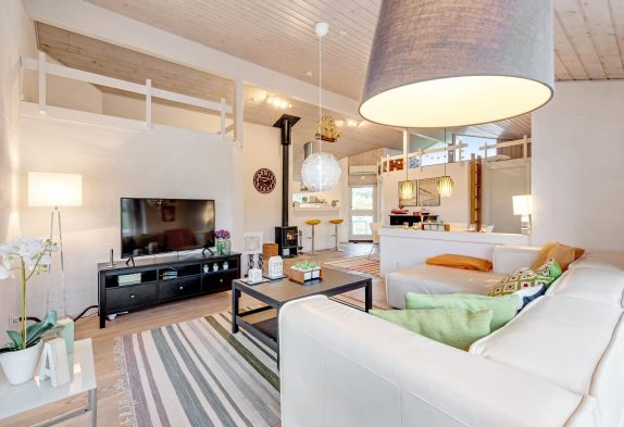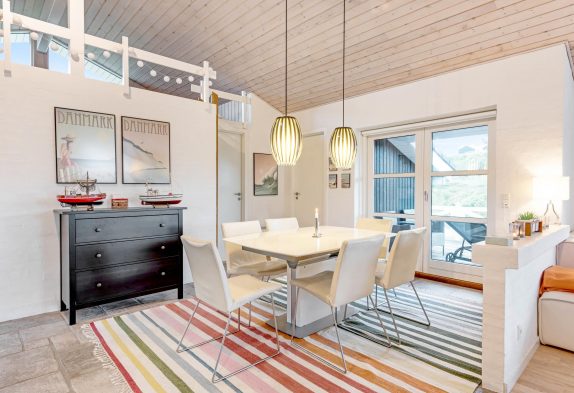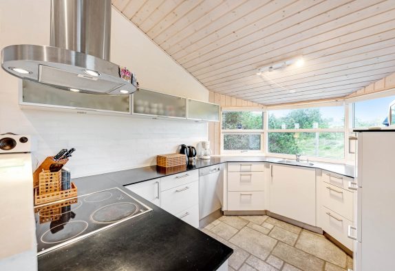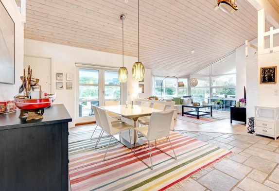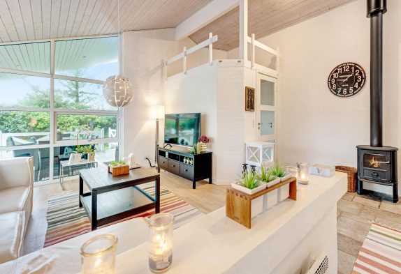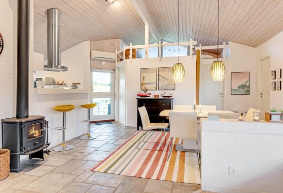 Det store, åbne køkkenalrum er husets hjerte. Her finder I både et godt og veludstyret køkken, et godt spiseområde samt et dejligt sofaafsnit med et flot kig til husets udeområde. Det store rum har højt til loftet og sammen med det flotte lysindfald, får man en god fornemmelse af plads omkring sig samtidig med, at de små hyggekroge skaber rum til fordybelse og nærvær. Når vejret ikke er til at sidde ude, er det helt oplagt at sidde i en god stol i stuen og nyde udsigten til svejende marehalm og forhøjninger i landskabet. På køligere dage er det oplagt at tænde op i husets brændeovn og kigge på flammernes knitren.