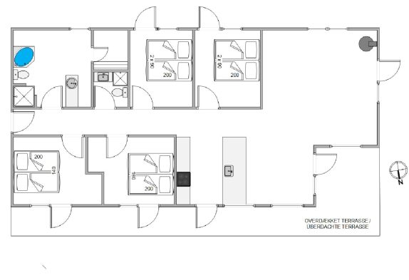 Også i husets uderum er der kælet for detaljerne. Her har man skabt hyggelige oaser rundt om huset, så du kan følge solens gang over himlen. Huset har en dejlig overdækket terrasse, som inviterer til lange, hyggelige sommeraftener i den friske luft. Her er det oplagt at nyde en god middag og en god flaske vin, mens børnene leger. Besøger I huset i den tidlige forårssæson vil den afskærmede terrasse desuden give læ og mulighed for at sidde ude og mærke de allerførste, varme forårsstråler i ansigtet.