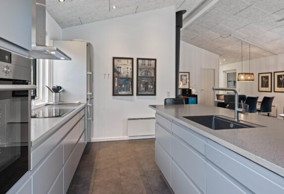De lyse lofter og vægge reflekterer lyset godt og sørger for en dejlige varm og indbydende atmosfære i indretningen. De sorte møbler og inventar skaber samtidig en god og moderne kontrast i indretningen. Det veludstyrede køkken ligger i åben forbindelse med stue og opholdsrum. Her har du et Bose Soundtouch 30 trådløst musiksystem, hvor du kan streame musik fra telefonen og den fungerer også som DAB-radio.