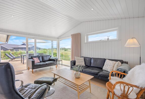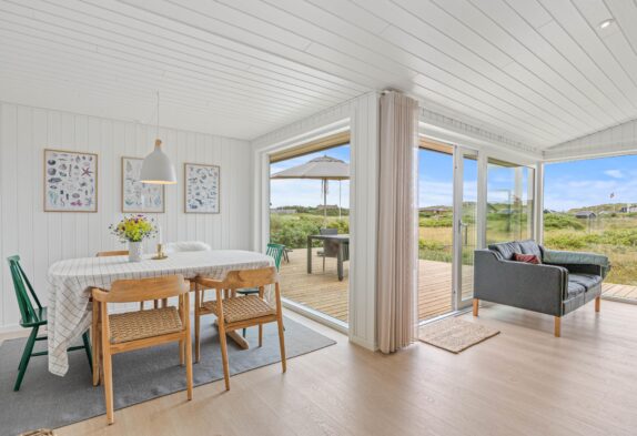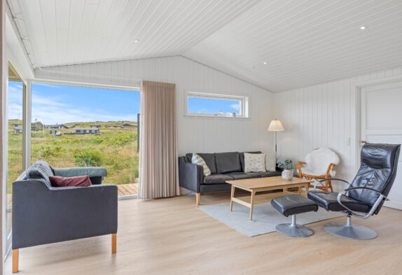 Sommerhusets køkken ligger i åben forbindelse med en dejlig spise- og opholdsstue. Det betyder, at familien er samlet, selvom I måske laver forskellige ting. Fra stuen er der desuden en utrolig flot udsigt over det flotte klitlandskab, som breder sig udenfor samtidig med, at de store vinduespartier byder en masse dagslys indenfor.