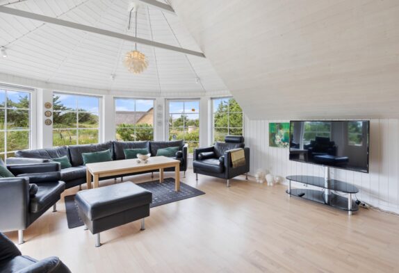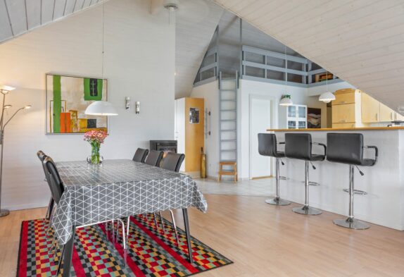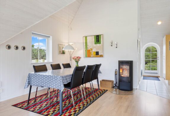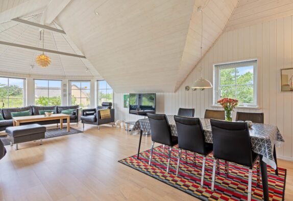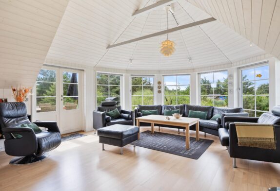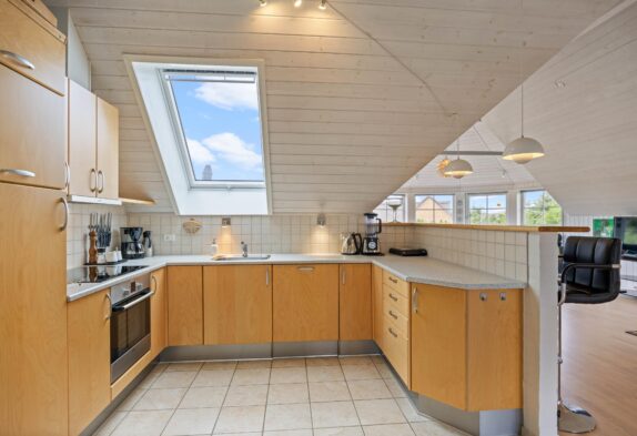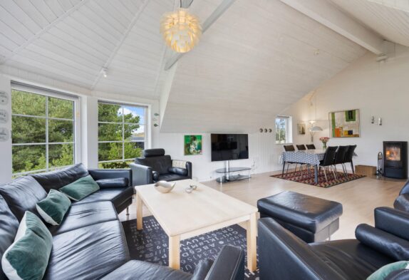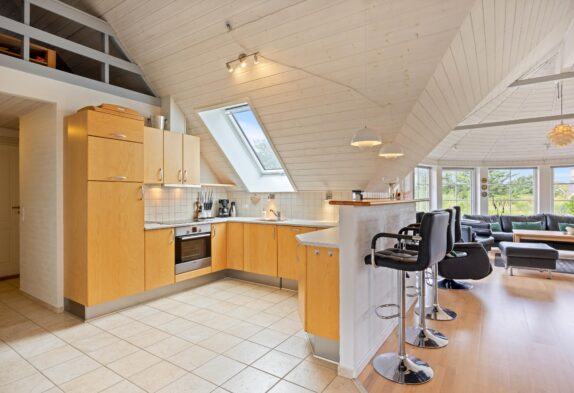 I sommerhusets midte, som også er sommerhusets hjerte, ligger det store køkken-alum med flot loft til kip, hvilket giver en god rumfornemmelse. Det er her familien mødes. Her er der masser af plads til, at børnene kan løbe frem og tilbage – mellem værelser og uderum. Gulvene er en flot kombination af lyse trælaminatgulve og praktiske klinker i køkkenområdet. De lyse farver i indretningen får inde- og uderummene til at flyde sammen, når dørene åbnes mod terrassen. Stuen ligger badet i et flot lys fra de mange vinduesfag, som inviterer naturen indenfor i indretningen.