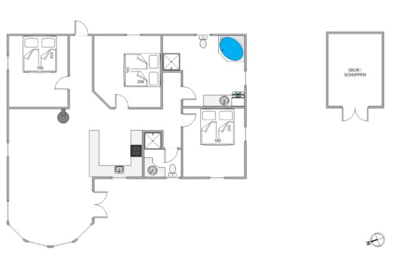 Fra stuen er der udgang til sommerhusets terrasse- og udeområde. Uderummet begrænser sig ikke bare til én terrasse, men til flere små, hyggelige oaser. Det betyder, at I kan følge solens gang på himlen og finde det rum, som passer bedst til vejr og vind. Samtidig giver det også masser af muligheder for leg for børnene.