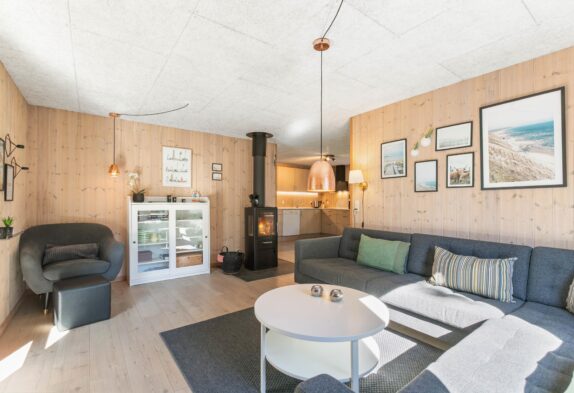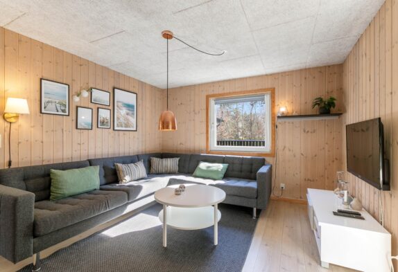 Stuens sofahjørne indbyder til totalafslapning – evt. til en god film eller med en god bog og kop kaffe foran den knitrende ild i brændeovnen.