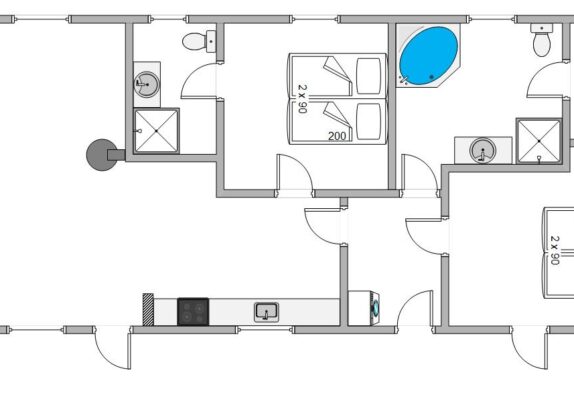 Når I bliver trætte, kan I fordele jer på de to soveværelser. Begge er rummelige, indrettet med dobbeltsenge og med god mulighed for opbevaring. Giv jer selv lov til at sove længe og nyde ferien! Skal I forkæles lidt ekstra på ferien, finder I heldigvis både sauna og spa på det store af feriehusets to badeværelser.