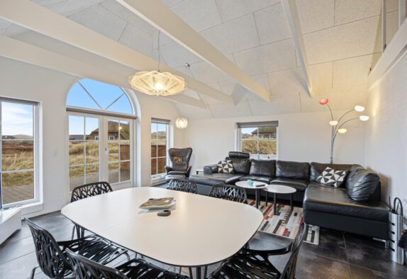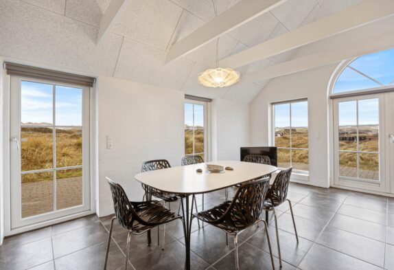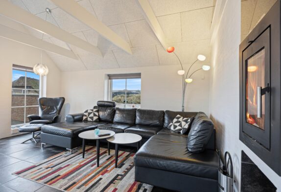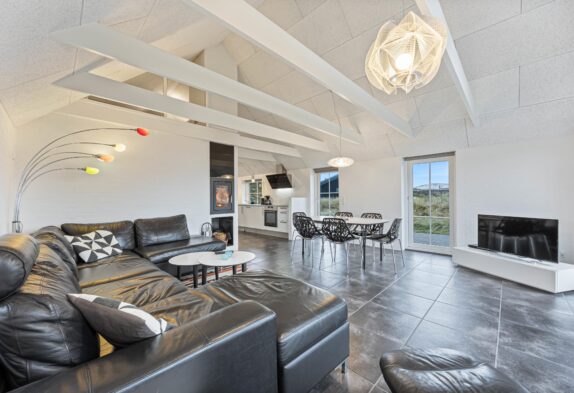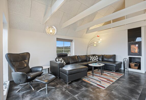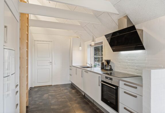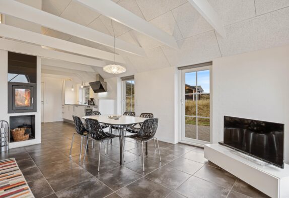 Når I kommer indenfor, vil I først komme ind i et fint bryggers, hvor der er plads til overtøj samt en vaskesøjle med vaskemaskine og tørretumbler – superpraktisk for børnefamilien og giver mulighed for at friske håndklæderne op undervejs. fra bryggerset fører en dør jer videre til feriehusets hjerte; det store opholdsrum. Her kombineres stue og køkken i ét rum, hvor der er plads til nærvær, hyggelige stunder og afslapning. Saml familien omkring spisebordet til en lækker middag eller spilleaften, mens brændeovnens varme breder sig.