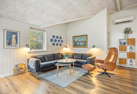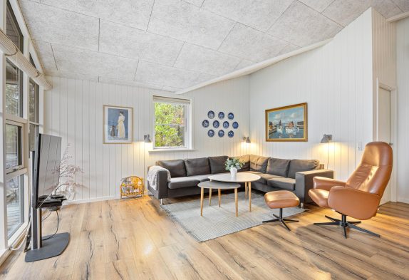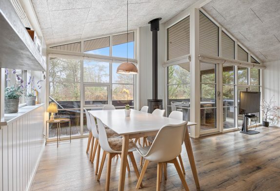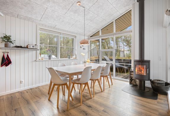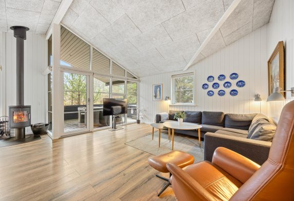 Sommerhusets varmepumpe og de energivenlige vinduer giver lavere el-omkostninger end i ældre huse. Og det flotte loft til kip giver både lys og luft, og det får sommerhuset til at virke større. Har man været en tur ved Vesterhavet er ild i brændeovnen en perfekt afslutning på dagen. Feriehusets gode fladskærms-TV er velegnet til gode film og fodbold.