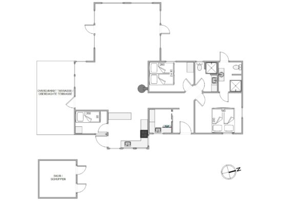 I syd er der en dejlig overdækket og afskærmet terrasse, hvor du kan nyde de gode sommerdage og grille om aftenen.