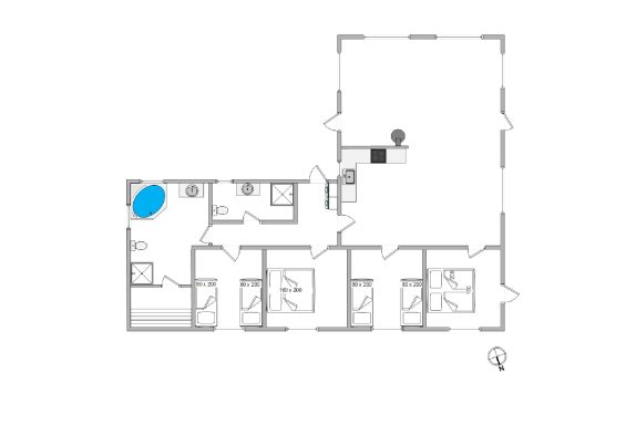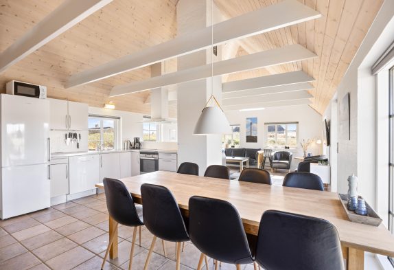 Feriehuset er flot, praktisk og hyggeligt indrettet, så du her har de rette elementer til en vellykket og afslappende ferie. Køkken/alrum og stue er i åben forbindelse, så du har kan være sammen med familien, uanset om nogle laver mad, mens andre ser tv, eller om I alle samles om et spil. Og hele vejen rundt er der store flotte vinduer, der sørger for et godt lysindfald samt en skøn udsigt til naturgrunden.