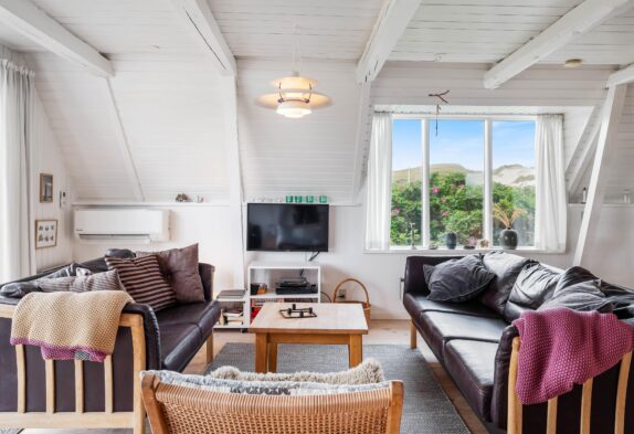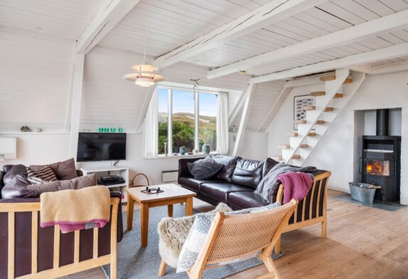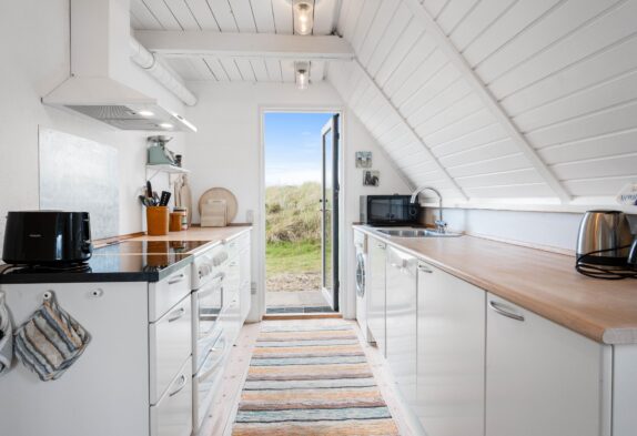 Det åbne køkken indeholder alt, hvad I behøver for at forkæle hinanden med lækre, hjemmelavede måltider. I det kombinerede opholdsrum kan I nyde varmen fra brændeovnen eller fra varmepumpen, mens I spiser eller spiller brætspil ved spisebordet. Også her kan I trække jer tilbage med en god bog i sofaen eller i lænestolen. De hvidmalede vægge og lofter giver sammen med det fine lysindfald en dejlig feriestemning. Nedenunder finder I feriehusets badeværelse. Her er gulvvarme, så I ikke fryserne tæerne, og har I brug for at blive varmet helt igennem, har sommerhusets også en sauna.