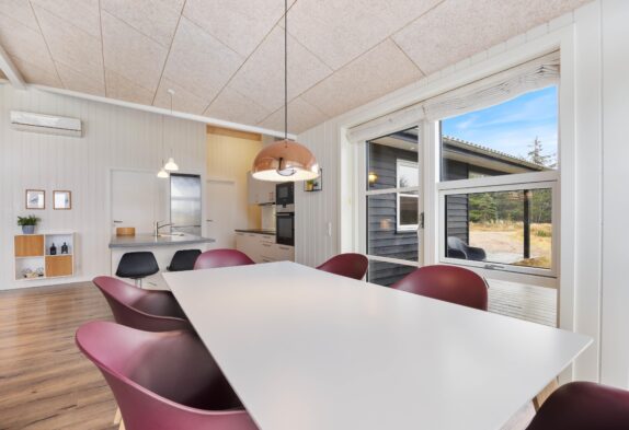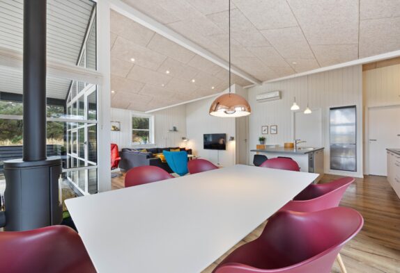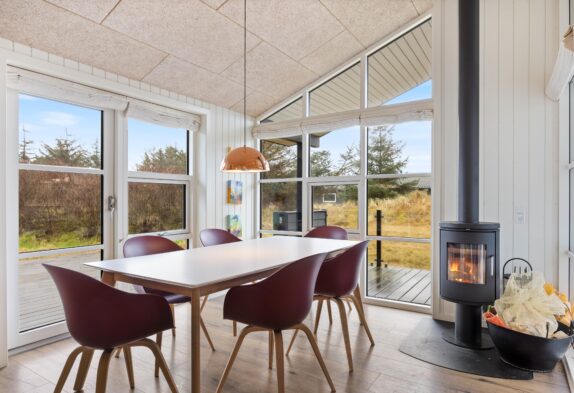 Stue, køkken og spiseområde er smeltet sammen til ét rum, og her vil I helt sikkert kunne tilbringe mange timer sammen. I det åbne køkken finder I alle faciliteter til at frembringe lækre måltider – eventuelt en temaaften med lækre saftige burgere. Her kan I have mange hyggelige stunder i køkkenet, omkring spisebordet eller i stuen med brætspil eller filmhygge – alt imens brændeovnen spreder varme og hygge. Herfra har I adgang til den lukkede terrasse.