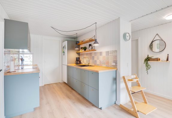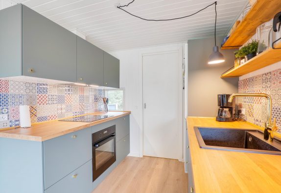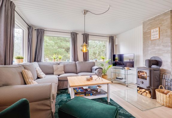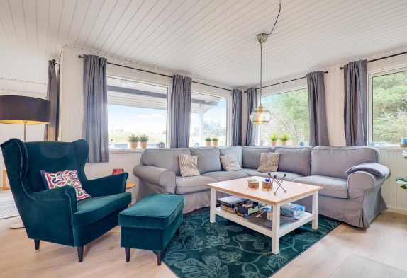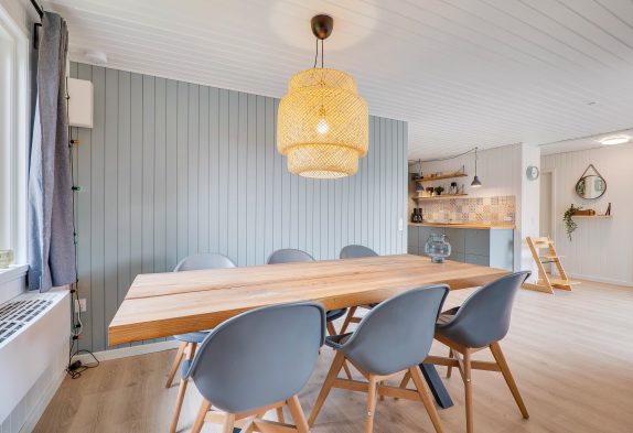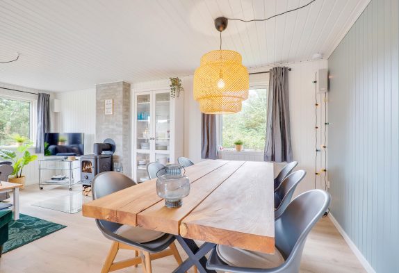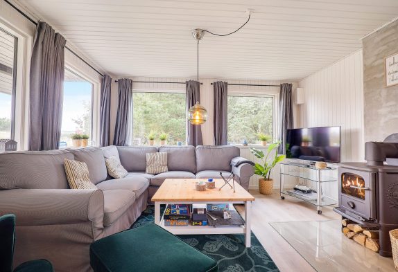 Inde i det blå sommerhus finder I 3 gode soverum og et køkken i forbindelse med det skønne leverum, hvor der er plads til hygge med hele familien. Her er både plads til brætspil, plads til at nyde et veltilberedt måltid og efterfølgende plads til at se en god film på langs i sofaen. Ekstra hygge spredes, når I tænder op i sommerhusets brændeovn – især efter en tur ved stranden eller netop hjemkommet med friskfanget fisk fra Hvide Sande, er det skønt.